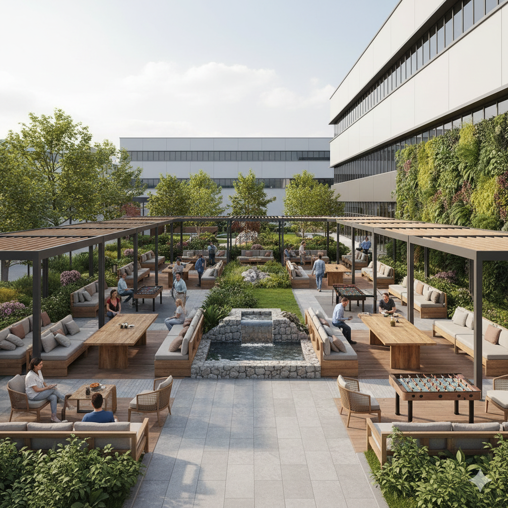 Üretim sahasının yoğun temposunda çalışan ekipler için fiziksel ve zihinsel dinlenme alanları projenin kalbinde yer alır. Tesisin geniş iç avlusunda kurgulanan açık hava dinlenme bahçesi, çalışanların vardiya aralarında sanayi atmosferinden tamamen uzaklaşarak nefes alabileceği, yeşille iç içe bir vaha niteliğindedir. Modern oturma grupları ve peyzaj düzenlemeleriyle zenginleştirilen bu alan, sosyal etkileşimi artırırken çalışanların işe çok daha zinde ve motive bir şekilde dönmelerine yardımcı olur.