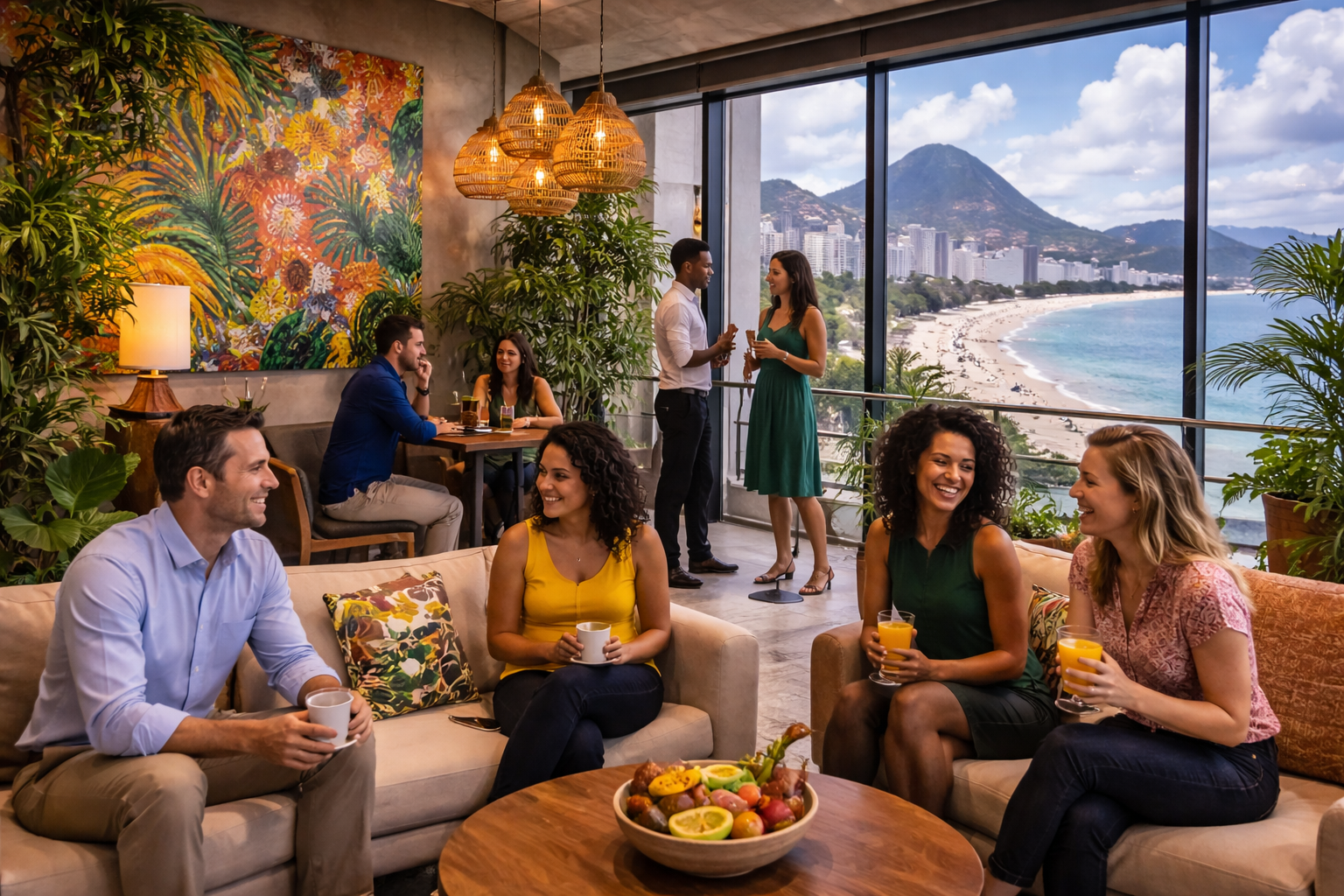Ofis tasarımı, Brezilya kültürünün ritmini ve enerjisini yansıtan özgün detaylarla şekillendirilmiştir. Amazon ormanlarından ilham alan doğal yeşil dokular, Rio karnavalını çağrıştıran renkli sanat panoları ve yerel zanaat motiflerinin işlendiği dekoratif objeler, çalışma alanına güçlü bir kültürel kimlik kazandırır. Açık planlı ofis yapısı, yaratıcılığı ve ekip içi etkileşimi desteklerken; geniş pencerelerden görünen Copacabana sahil hattı ve Pão de Açúcar manzarası, çalışanlara ilham veren bir atmosfer sunar. Rio ofisi, Karonat’ın global kurumsal duruşunu yerel kültürel dokuyla buluşturan benzersiz bir mekân olarak tasarlanmıştır.